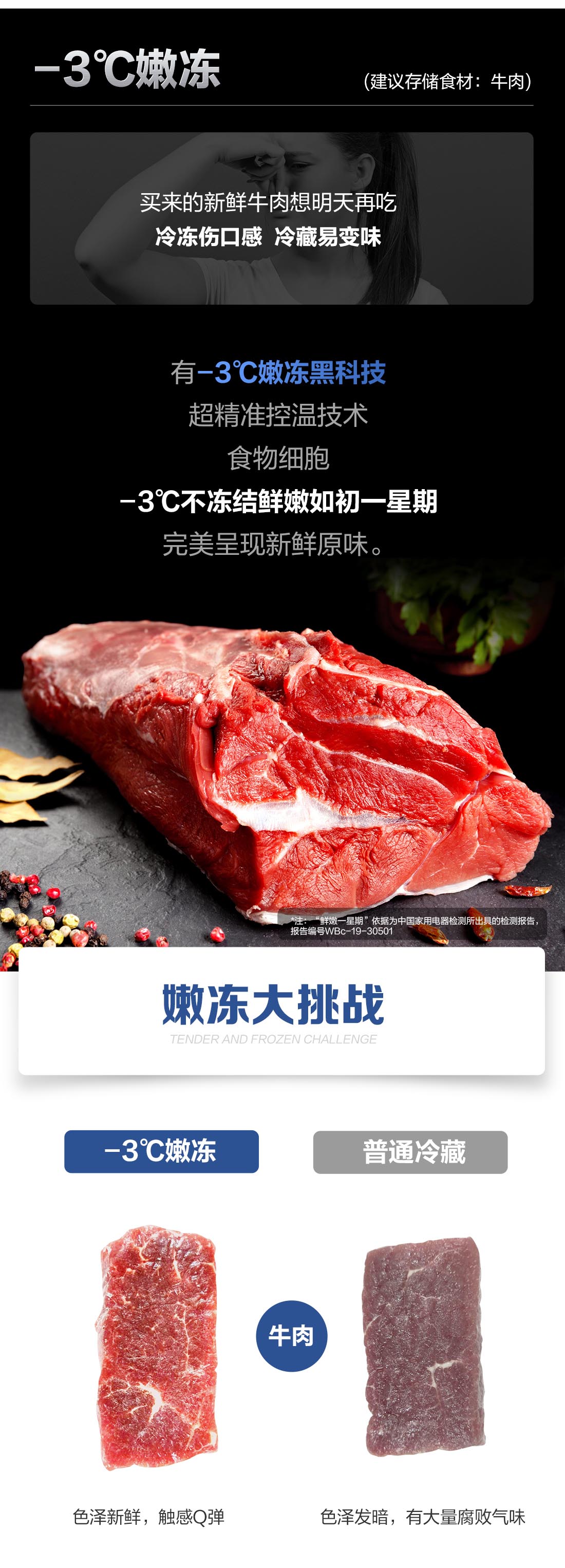 搭載-5℃瞬凍黑科技,鮮嫩兩星期,輕松一刀切。細胞級養(yǎng)鮮,營養(yǎng)流失少。搭載-3℃嫩凍黑科技,食材不結(jié)冰,鮮嫩一整周。智能全變頻技術(shù),恒溫保鮮,節(jié)能靜音。