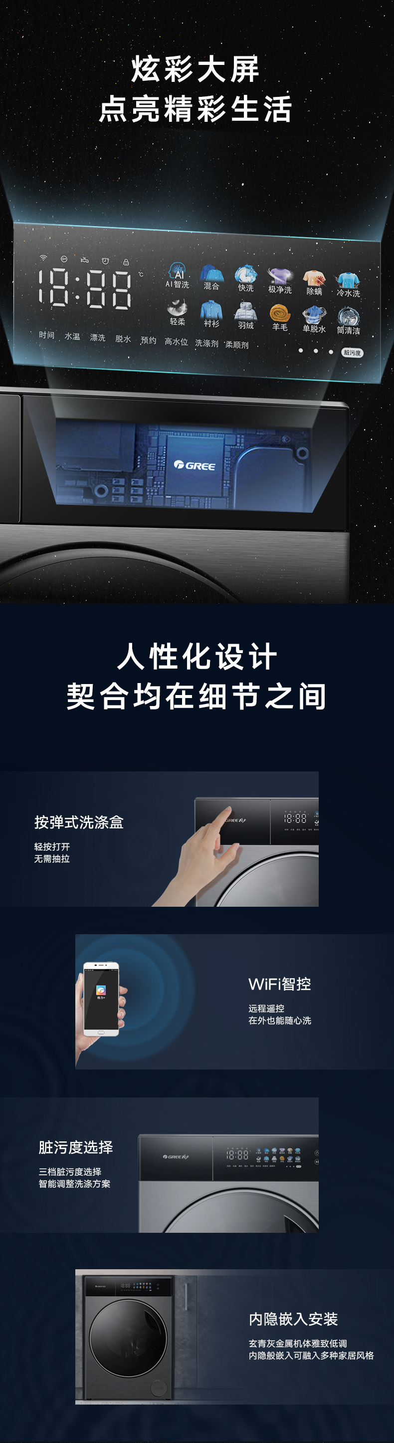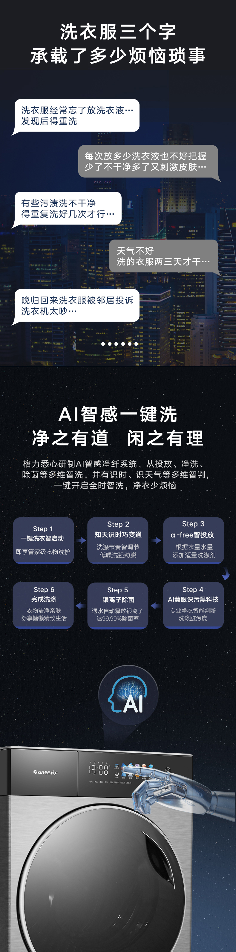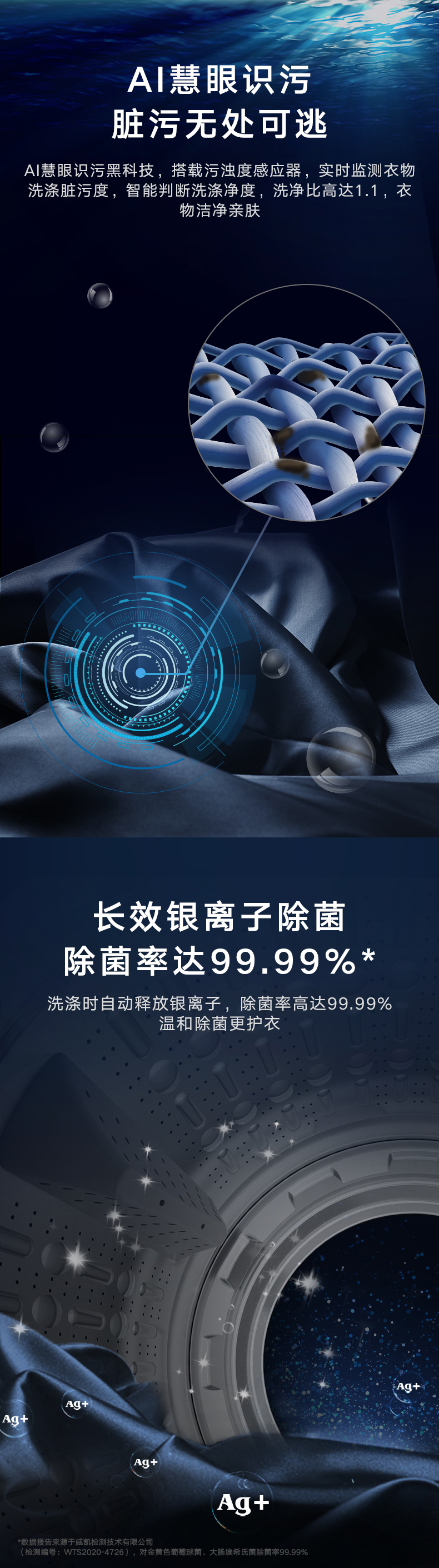 AI智能感應(yīng),臟污一鍵洗凈。AI慧眼識污,智能判斷洗滌凈度,洗凈比高達1.1