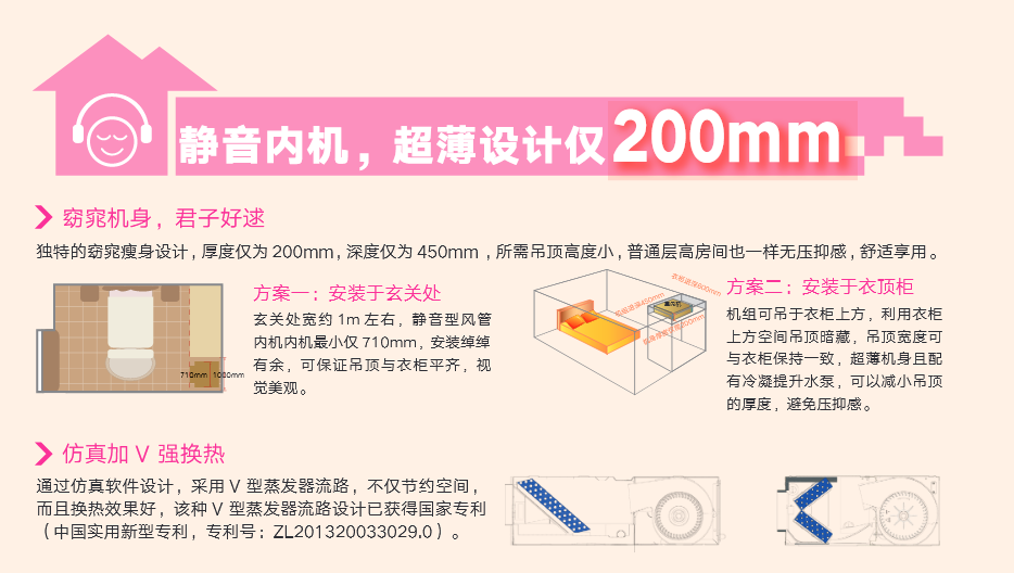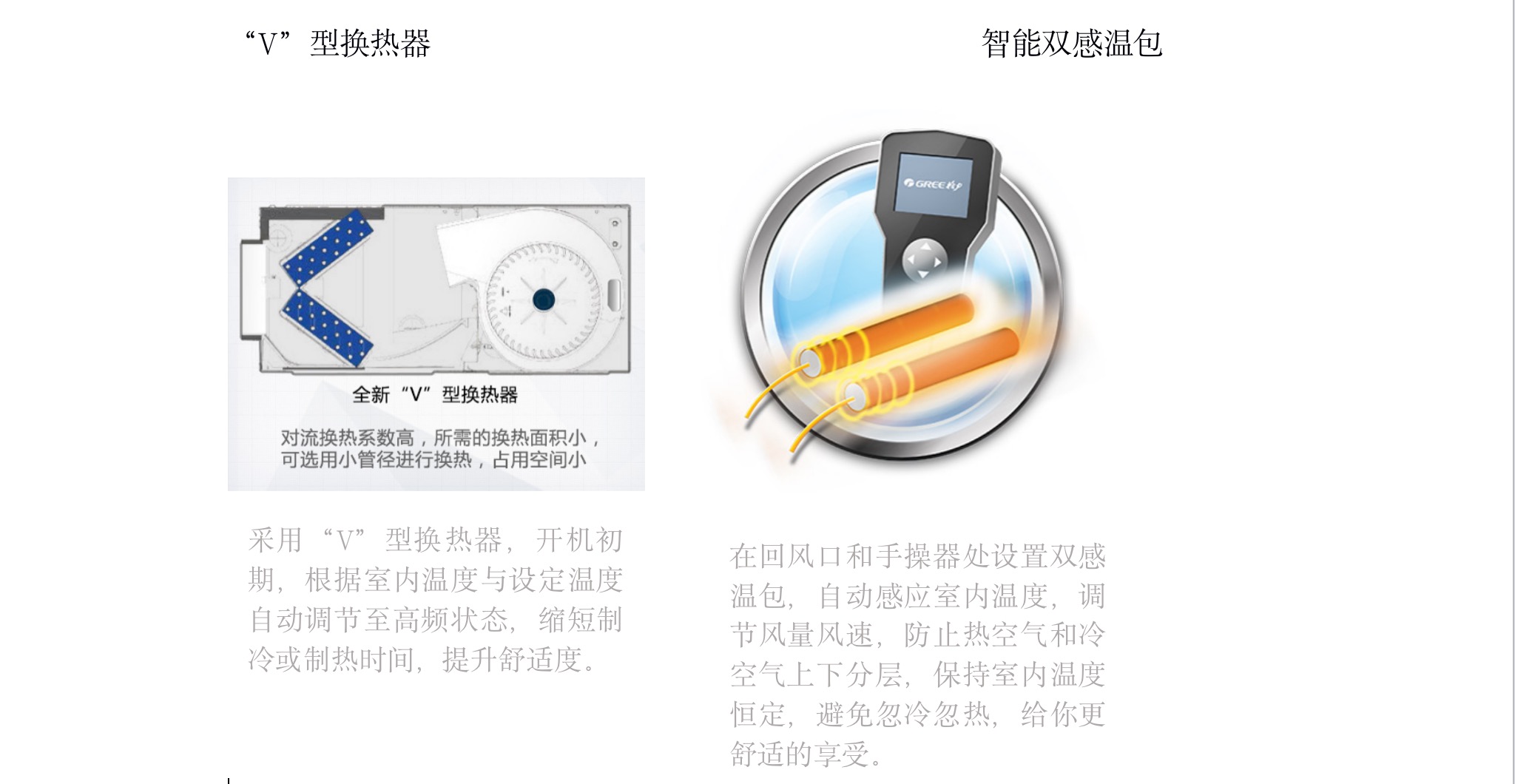 采用“V”型換熱器,開機初期,根據(jù)室內(nèi)溫度與設定溫度自動調(diào)節(jié)至高頻狀態(tài),縮短制冷或制熱時間,提升舒適度